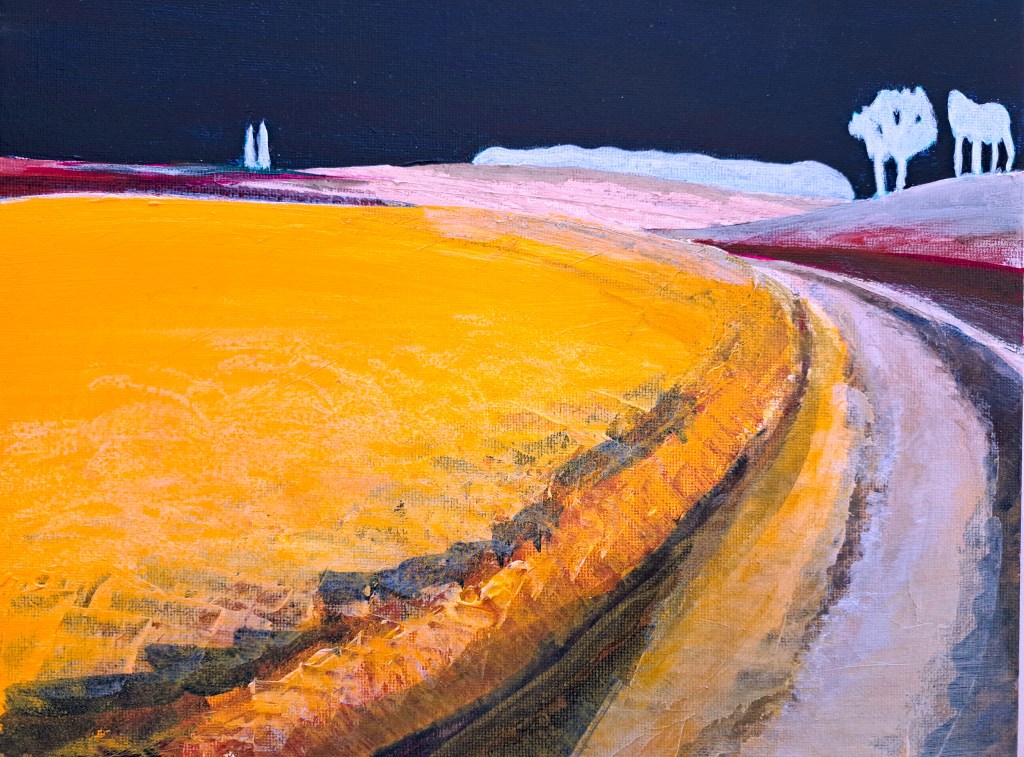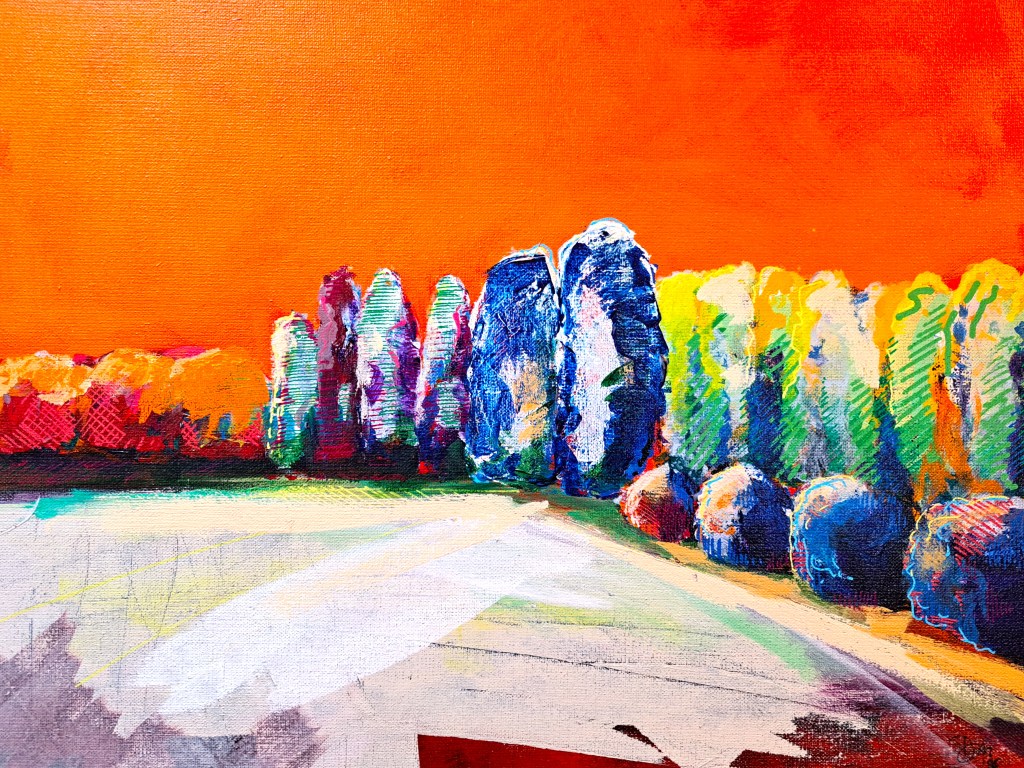 KLEUREN IN ACRYL, KRACHTIG EN EXPRESSIEF OF INGETOGEN EN SUBTIEL, DAT BOEIT ME ENORM. VERTREKKEN VAN EEN HERKENBAAR BEELD EN DAT VERVOLGENS LAAG VOOR LAAG EN OOK MET GEMIXTE TECHNIEKEN STEEDS MEER EEN EIGEN LEVEN LATEN LEIDEN, ZONDER DE HERKENBAARHEID TE VERLIEZEN, ZO WERK IK. OP DIT MOMENT ZIJN LANDSCHAPPEN UIT DE HASPENGOUW MIJN PASSIE
